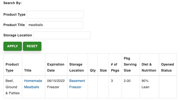 Here is a great way to use the Millpondfarms.com system. Finding food in the freezer for dinner is super easy. Using the system I searched on meatballs and found that I had several packages of meatballs in the Basement Freezer. I adjusted that product item when I took a package out of the freezer.